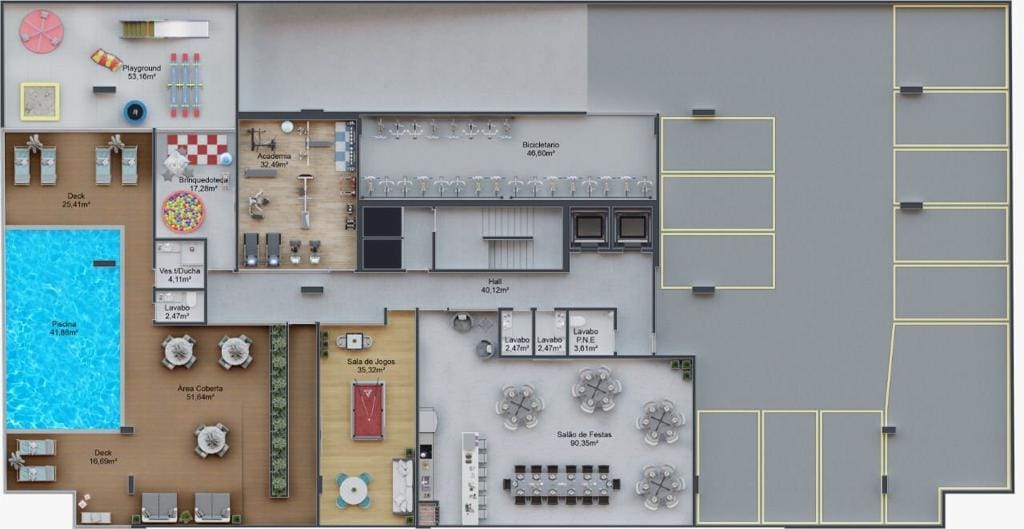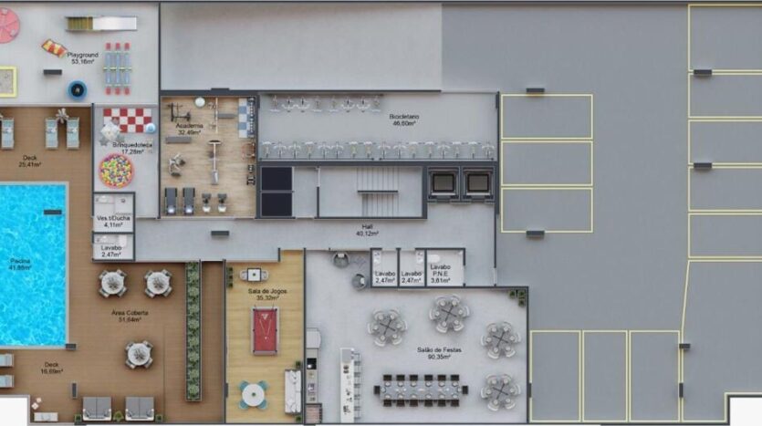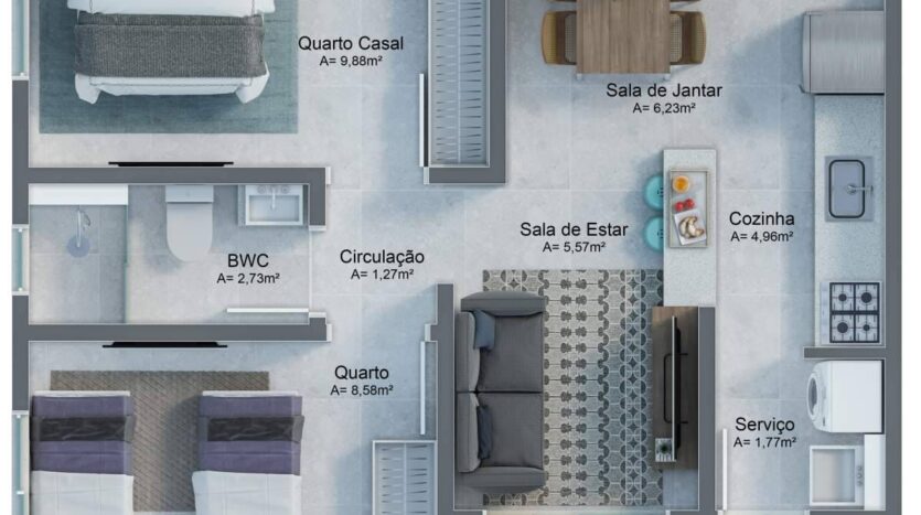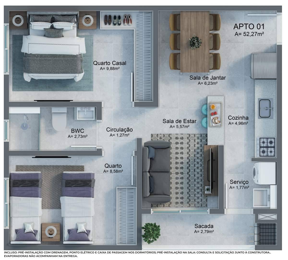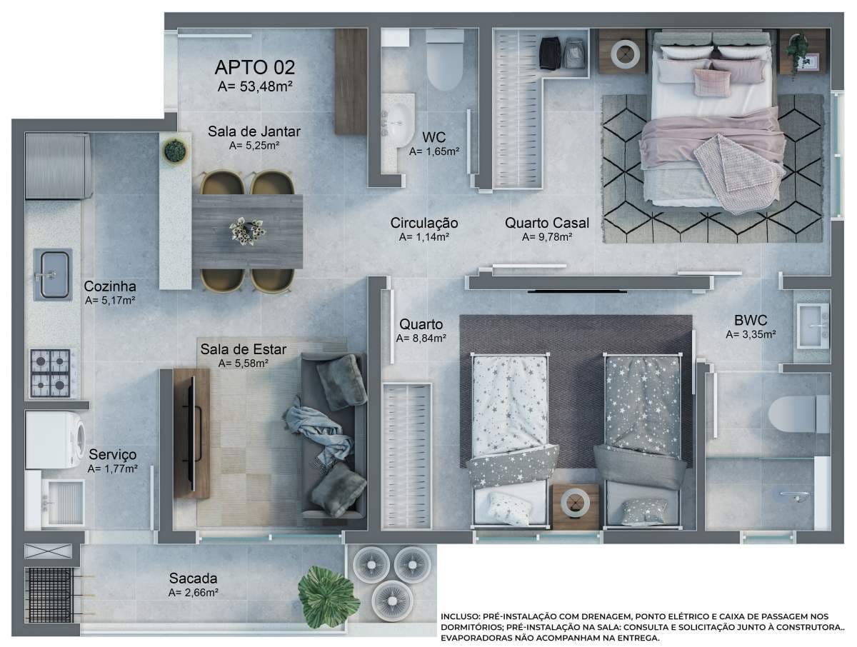 – O apartamento da planta 02, possui 63m², divididos em: