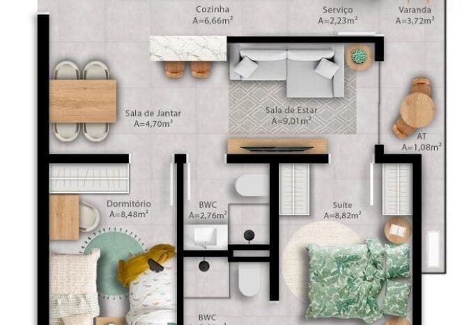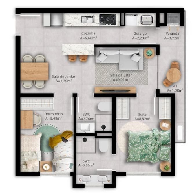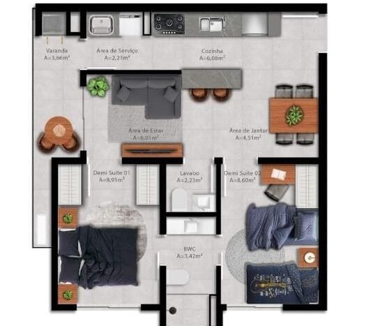 2 dormitórios, 2 dormitórios com suíte ou demi-suíte